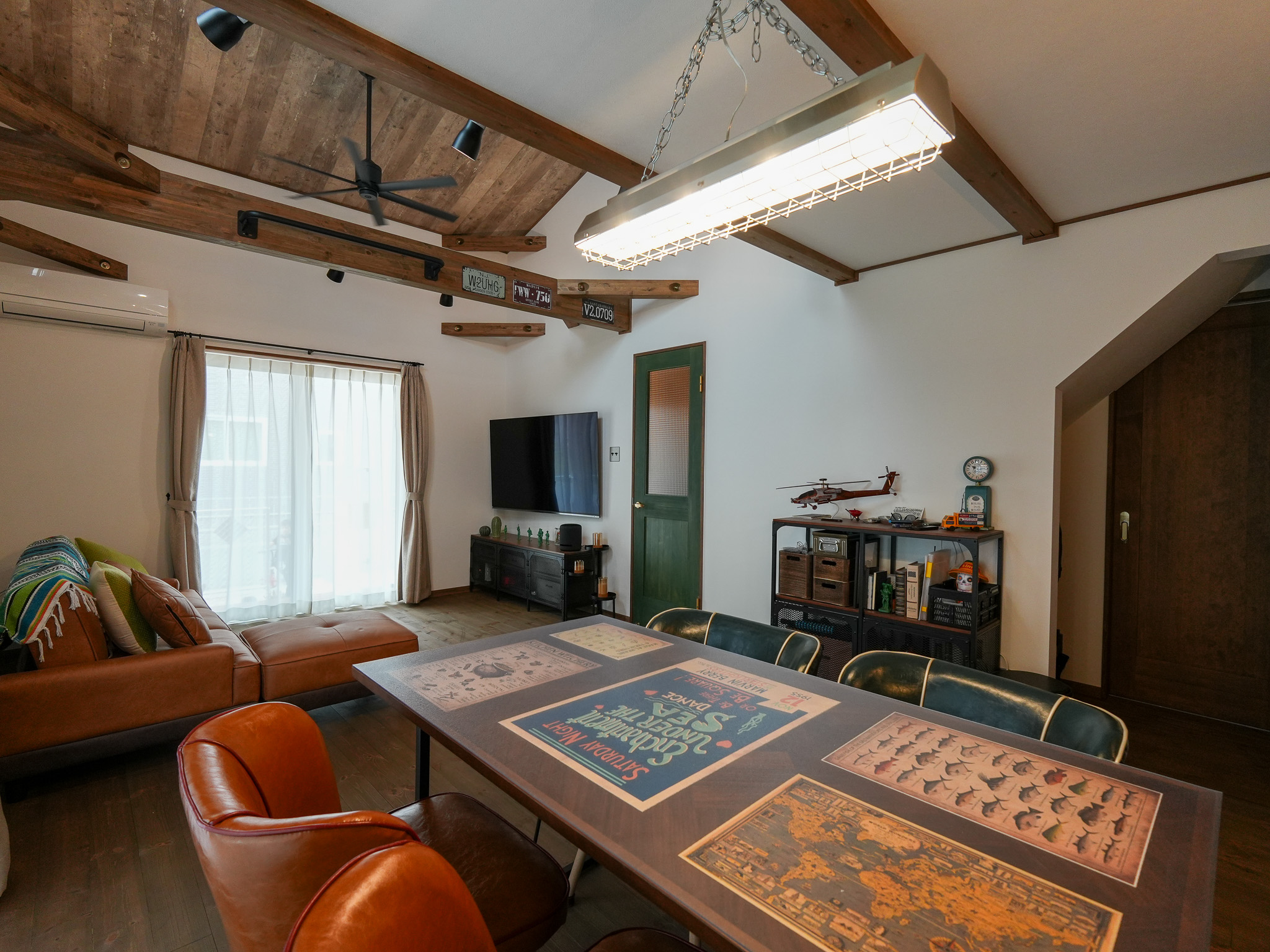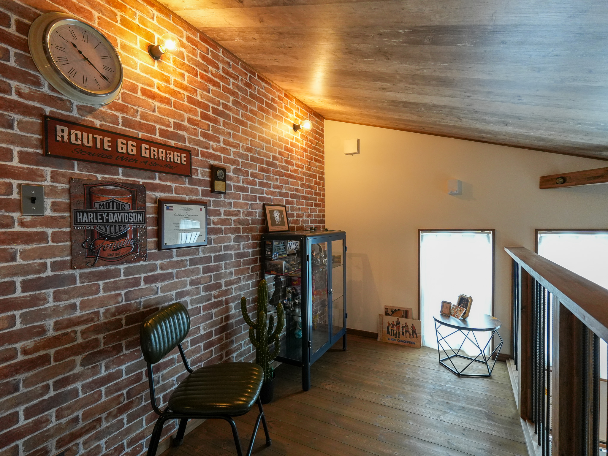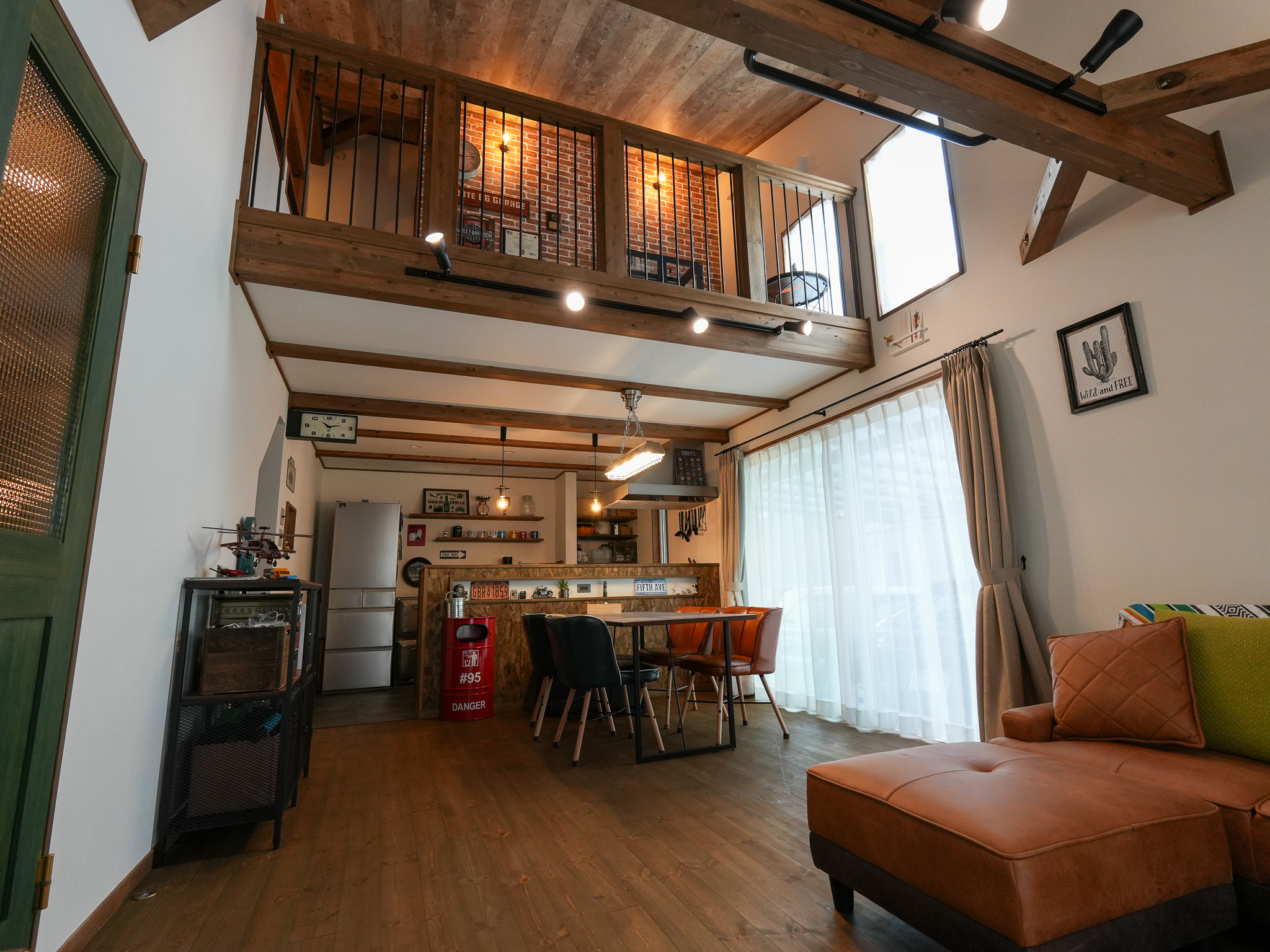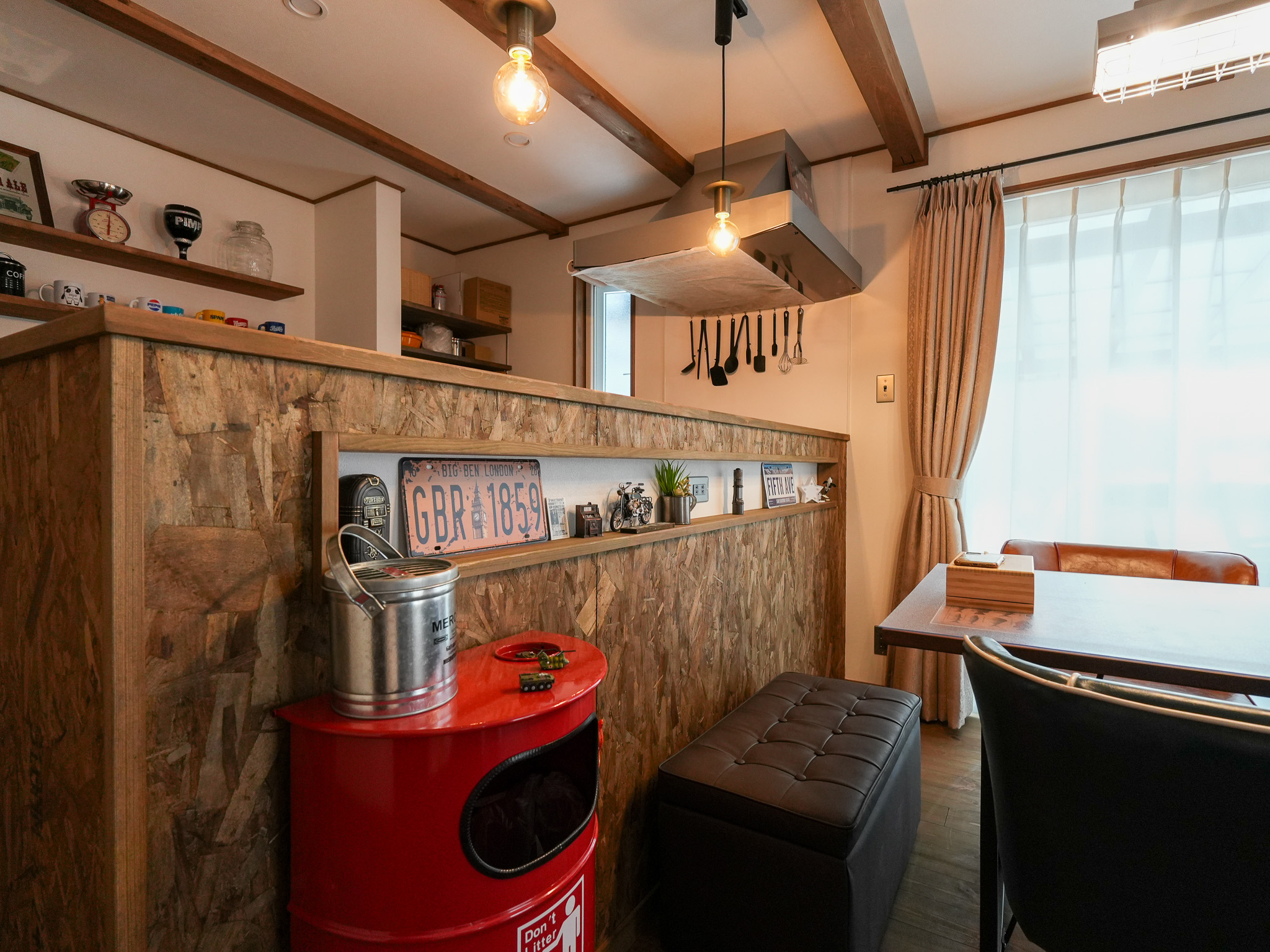 オリーブカラーを基調とした内装に、OSB合板やレンガ調の仕上げを取り入れることで、ブルックリンスタイルの落ち着いた大人のコーディネートをプラスしています。