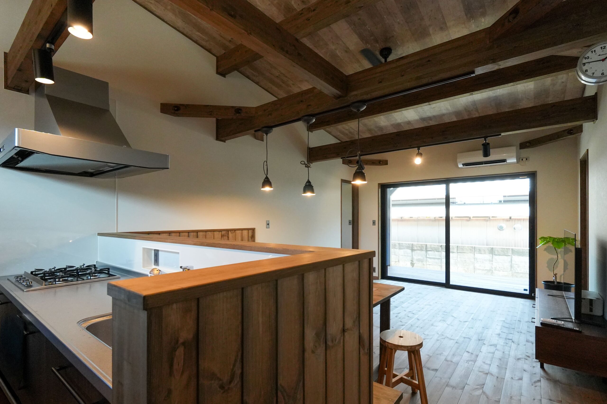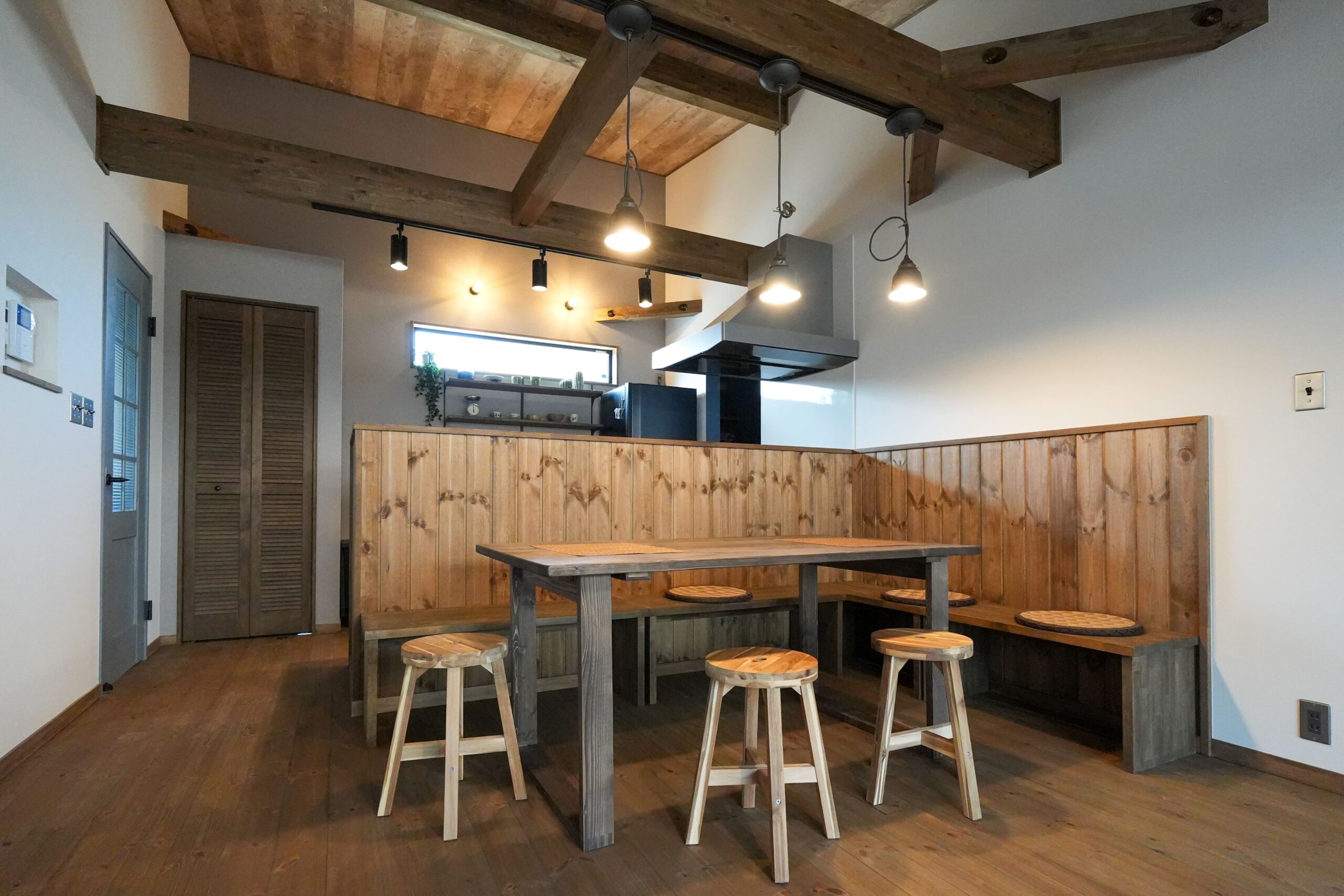 一覧 < new back > 家の原点「平屋」 プラン:COVACO 造作のL字型ベンチは、家族や友人との団らんを楽しむ憩いの場所。 軒のある広々としたウッドデッキや、ご主人の趣味道具をすっきり収納できるアウトサイドストッカーも魅力です。 一覧 < new back >